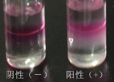 3.樣品檢測:另取一支0.5mL 吸管,吸取試劑C至吸管細部前端約1/4 處(約0.125mL),插入至試劑B瓶的下層溶液中并緩慢排空,觀察B瓶下層溶液中是否產生渾濁絮狀物或沉淀物。