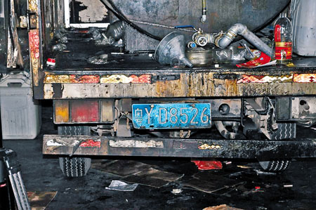制假現(xiàn)場(chǎng),一輛改裝車的車廂中,黑乎乎的大油箱內(nèi)裝滿了劣質(zhì)油