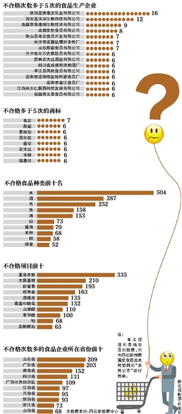 根據(jù)新京報統(tǒng)計,自今年1月1日至11月26日,國家食藥監(jiān)總局在“總局公告”里公布了3600余批次不合格食品,有具名的“生產(chǎn)企業(yè)”2293家。根據(jù)同花順數(shù)據(jù)中心分析,449家企業(yè)被通報2次(含)以上,占19.6%。而被通報達5次及以上的企業(yè)數(shù)量為29家,占具名生產(chǎn)企業(yè)總數(shù)的1.3%。