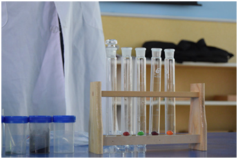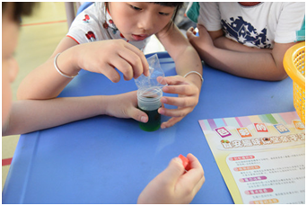 實驗課的開頭,林老師拿出提前準備好的試管,里面加了兩個神秘的糖豆,讓小朋友在試管中加入水,搖晃幾下,只見水的顏色也從原來的透明變成了糖豆的顏色,小盆友們都瞪大了眼睛并且看的津津有味,還不時露出驚訝的表情。