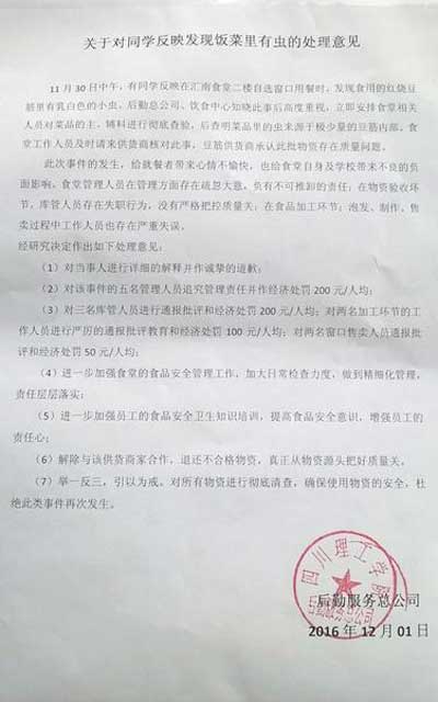 12月1日,四川理工學院后勤服務總公司在食堂周邊粘貼了一份《處理意見》,稱已經(jīng)查明該乳白色小蟲來自存在質(zhì)量問題的豆筋內(nèi)部,對涉及該事件的12名責任人進行通報批評和50-200元不等的經(jīng)濟處罰,并與該供貨商解除合作。