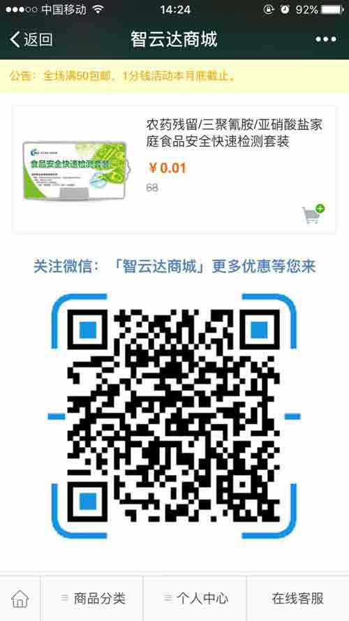 當下微信人群活躍度高,微商城的開通為消費者在隨時隨地選購食品安全快速檢測產品開通一條更為優惠、方便的購物通道。那么如何在智云達商城購買產品?