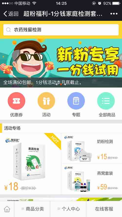 商城開業特推出一分錢試用活動,價值68元的食品安全家庭檢測套裝只要一分錢,一分錢能買到什么,你沒聽錯,可以檢測農藥殘留、三聚氰胺、亞硝酸鹽,名額有限,檢測套裝帶回家。