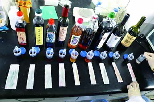 北京智云達技術工程師楊老師和王老師通過使用北京智云達自主研發生產的快速檢測產品:紅葡萄酒摻偽速測盒,對樣品溶液進行檢測。
