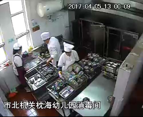 浙江寧波北侖區教育局裝備中心主任樂納紅在接受中新網記者采訪時透露,北侖區公辦的中小學、幼兒園的食堂后廚基本全部安裝有監控設備。