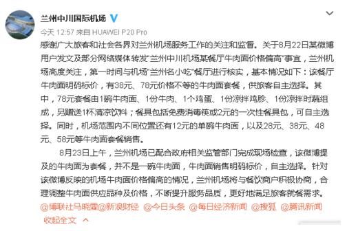8月23日上午,蘭州機場已配合政府相關監管部門完成現場檢查,該微博提及的牛肉面為套餐,并不是一碗牛肉面,牛肉面銷售明碼標價,自主選擇。針對該微博反映的機場牛肉面價格偏高的情況,蘭州機場將與餐飲商戶積極協商,合理調整牛肉面供應品種及價格,不斷提升服務品質,更好地滿足旅客就餐需求。