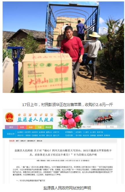 這篇名為《痛心!四川大涼山眼看大雪封山,50萬斤脆甜丑蘋果搶收不及,求你幫老人孩子渡過這個難關!》的帖文,配發了數十張照片,多數都是老人、小孩的照片,文字描述得十分悲慘,將鹽源蘋果描述為“丑蘋果”。內容稱,因為天災頻繁,交通不便,蘋果難以運出山里進行售賣,收購價被壓到兩三毛錢一斤?!班l親們也無奈,他們條件不足,越早摘越能賣個好價錢,只能讓收購商低價收走。我們不忍心跟他們說,山外的原生態蘋果往往都能賣出十幾元一斤?!?br />