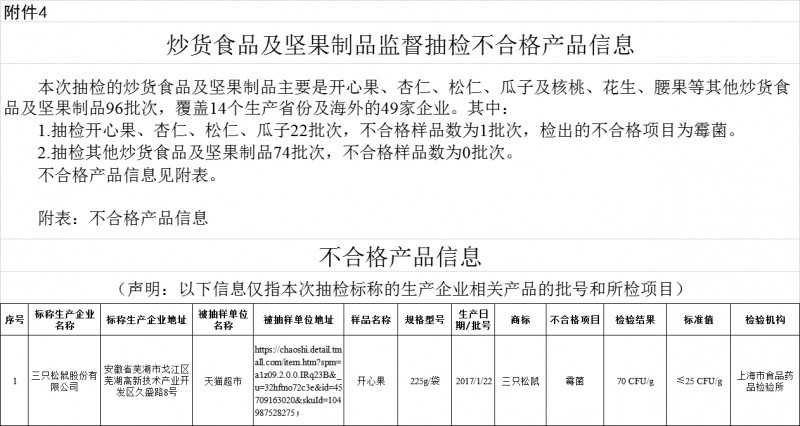 2017年8月15日,國家食品藥品監督管理總局發布3批次食品不合格情況,其中就包括三只松鼠開心果,而不合格的原因則為霉菌超標。