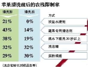 實驗結(jié)果:實驗人員介紹,從本次實驗看,鹽水浸泡后再沖洗,蘋果的農(nóng)殘抑制率直接從21%降為零,效果最明顯。其次是專門的果蔬清潔劑,去除農(nóng)殘也還不錯。另外,流水下直接搓洗,也能在一定程度上幫助去除農(nóng)殘。但選用洗潔精以及水中加入面粉揉搓,效果并不明顯。