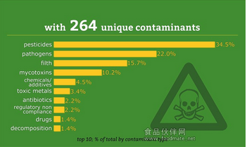 統(tǒng)計(jì)數(shù)據(jù)還顯示,出問題的食品包括:海鮮(23.5%)、蔬菜(20%)、水果(13.8%)、香菜/調(diào)味品(8.9%)、乳品(7.5%)。食品違規(guī)類型包括農(nóng)殘(34.5%)、病菌(22.0%)、污物(15.7%)、真菌毒素(10.2%)、化學(xué)物質(zhì)/添加劑(4.5%)。