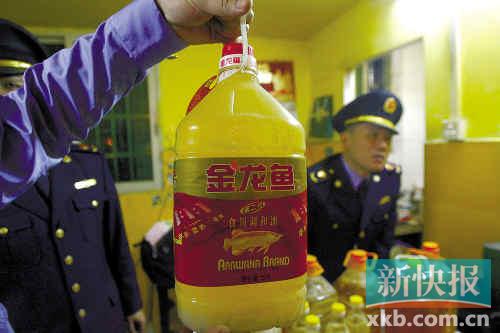 天河區(qū)工商所曾在一雜貨店查處340多罐假冒偽劣地溝油,不法商人將其假冒成"金龍魚"等食用油。