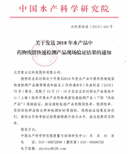 2018年10月17-19日北京智云達科技股份有限公司參加了由農業農村部漁業漁政管理局主辦,中國水產科學研究院承辦的“2018年水產品中藥物殘留快檢產品的驗證”工作。此次驗證在農業農村部水產品質檢中心(上海)舉辦,現場來自21家快檢企業參加了驗證。這次驗證的項目包括氯霉素、呋喃四項、孔雀石綠等共六個項目,是近年來驗證項目最多的一次?,F場每個項目使用2個批次產品共檢測84個樣品,檢測指標包括假陽性率、假陰性率、實際樣本檢出率和檢測時間等指標。檢測結果包括專家評判和技術人員自評兩個環節,評判結果表明智云達驗證的產品全部符合評價標準要求,特向市場推薦使用!