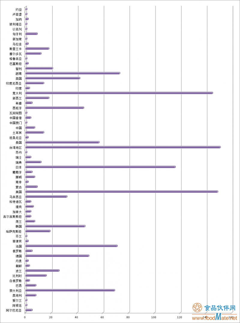 統計顯示,這些食品來自六十多個國家或地區(qū)。其中,意大利、美國、日本這些國家以及臺灣地區(qū)的不合格食品居多,尤以臺灣地區(qū)的最多。