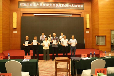5月22日上午,培訓班結業式上,農業農村部農產品質量安全中心檢驗檢測處處長王艷、石家莊市農業農村局黨組副書記、副局長劉軍普出席,向優秀學員代表頒發培訓優秀證書并講話。同時,感謝北京智云達為本次畜產品質量安全快速檢測技術培訓班的培訓、技術支持等相關工作。