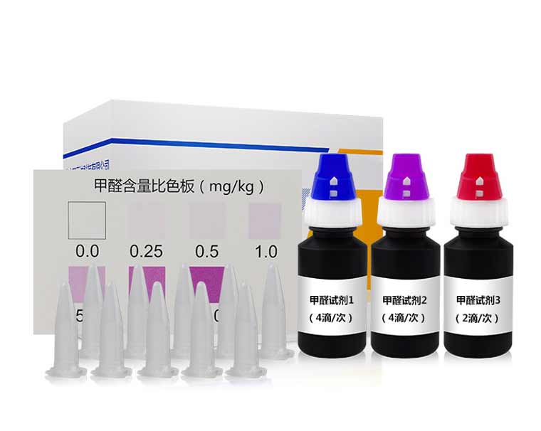 甲醛與顯色劑反應生成紫色化合物,與比色卡進行顏色比對,得出甲醛含量。