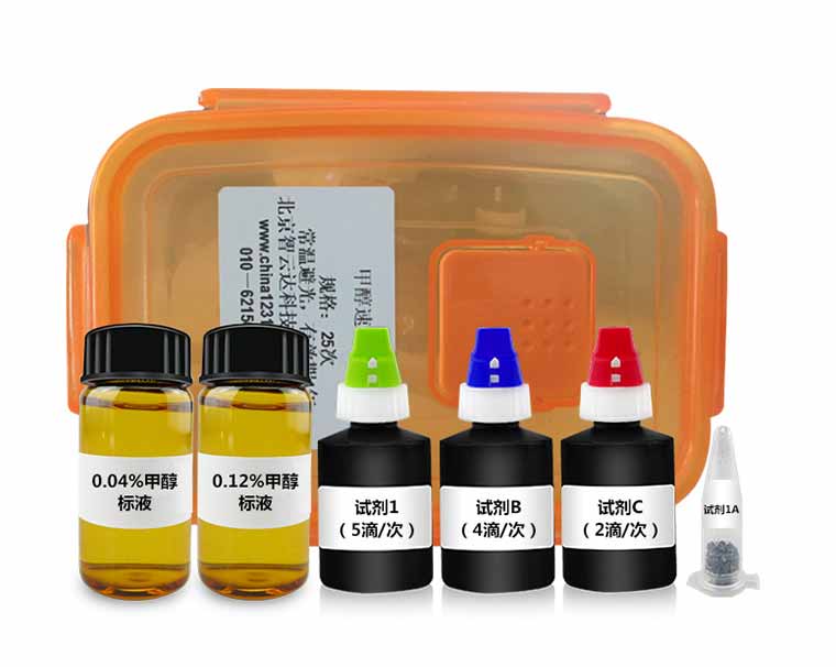 甲醇和乙醇在色澤與味覺上沒有差異,酒中微量甲醇可引起人體慢性損害,高劑量時可引起人體急性中毒。我國發(fā)生的多次酒類中毒,都是因為飲用了含有高劑量甲醇的工業(yè)酒精配制的酒或是飲用了直接用甲醇配制的酒而引起。國家食品衛(wèi)生標(biāo)準(zhǔn)規(guī)定:以糧食為原料的蒸餾酒或酒精勾兌的白酒中甲醇含量應(yīng)≤ 0.04g/100ml;以薯干及代用品為原料的蒸餾酒中甲醇含量應(yīng)≤ 0.12g/100ml。本速測盒適用于蒸餾酒中微量(0.02% 以上)甲醇的現(xiàn)場快速測定,也適用于經(jīng)過重新蒸餾的配制酒(以發(fā)酵酒、蒸餾酒或食用酒精,添加糖、色素、香料、果汁配成的酒,或以食用酒精浸泡植物的根、莖、葉、果實等配制的酒)中微量甲醇的快速測定。