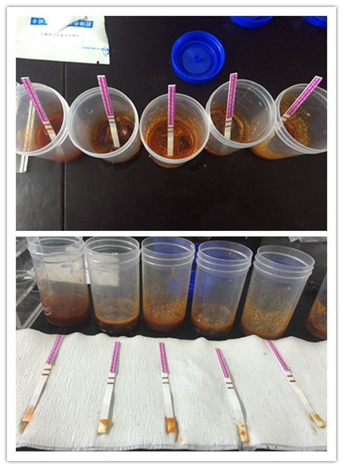 我們隨機取一點火鍋底料,放入干凈的容器中,加入5ml蒸餾水進行溶解,發現有幾種由于含油量較高,凝結成塊,無法很快溶解,因此我們對其稍微加熱,使得完全溶解。完全溶解后即得到我們的火鍋樣品。