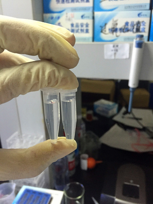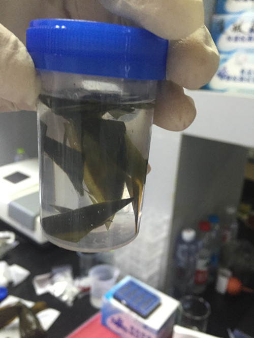 首先我們將粽子打開,稱取剪碎的粽葉0.8g于提取瓶中,加蒸餾水或純凈水 20mL,蓋上蓋振搖 1 分鐘,放置 10min,期間可振搖加快提取,其上清液為樣品液。之后吸取 1mL 樣品液于 1.5mL 離心管中,滴加 3 滴銅試劑 A,滴加 3 滴銅試劑 B,滴加 6 滴銅試劑 C,蓋塞混勻,靜置 10min,最后觀察溶液顏色變化。溶液變藍色或者綠色,說明含有硫酸銅;溶液不變色說明樣品未噴灑硫酸銅。其中,空白測定:用純凈水或蒸餾水替換銅試劑 C,其它操作與樣品測定相同。