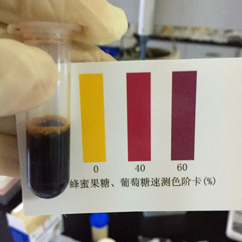 吸取稀釋液2滴到另外一支離心管中,加入10滴測試劑,搖動幾次后放入水浴鍋中沸水浴5min,水浴完畢后取出,加入1.5ml蒸餾水。之后與比色卡比對,讀取含量,我們可以看到含量超過60%為真蜂蜜。