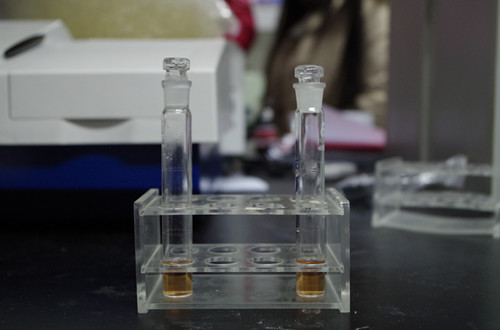 在10 mL比色管中,加入4滴樣品提取液,0.8 mL蒸餾水,1.0 mL試劑2,2滴試劑3,混勻,加4滴試劑4,混勻,再加4滴試劑5,搖勻后,室溫放置20分鐘。
