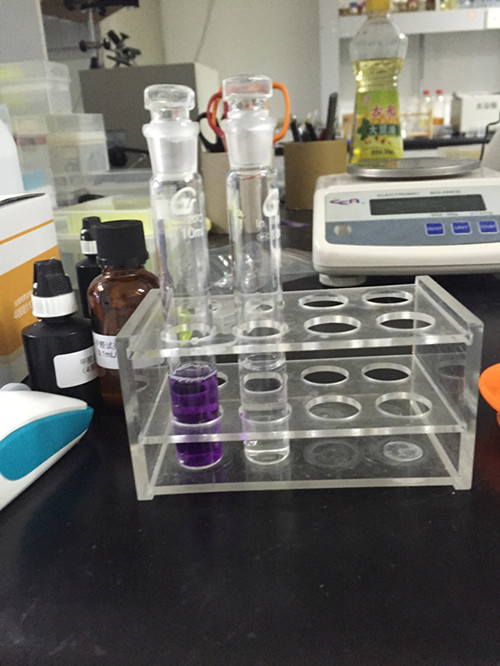 樣品管:取1 mL樣品液于10 mL比色管中,滴加4滴A溶液,再滴加4滴B溶液,搖勻,放置20 min,期間搖動6次,再加入0.1 mL C溶液,搖動30秒,放置5 min,用蒸餾水稀釋至5 mL刻度線,搖勻。