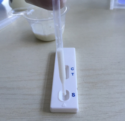 用干燥、潔凈的比色管盛放奶粉,用純凈水1:10稀釋(1份奶粉+10份純凈水),溶解后用于檢測。
