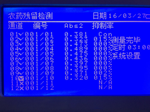 檢測(cè)結(jié)果如圖所示,結(jié)果以酶被抑制的程度,即抑制率表示。當(dāng)果蔬樣品提取液對(duì)酶的抑制率為40~50%時(shí),則表明被測(cè)樣品為可疑農(nóng)殘超標(biāo)樣品;當(dāng)抑制率≥50%時(shí),表示蔬菜中有高劑量有機(jī)磷或氨基甲酸酯類(lèi)農(nóng)藥存在,樣品為陽(yáng)性結(jié)果。所以樣品中農(nóng)藥殘留符合國(guó)家標(biāo)準(zhǔn)。