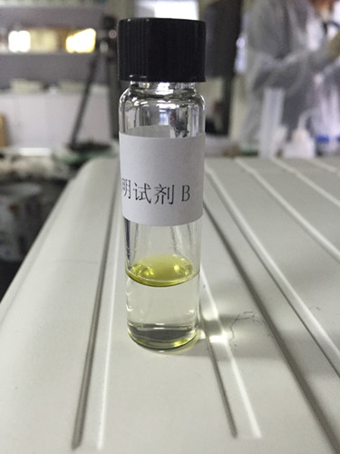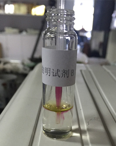 另取一支0.5 mL吸管,吸取試劑C至吸管細部前端約1/4處(約0.125 mL),插入至試劑B瓶的下層溶液中并緩慢排空,觀察B瓶下層溶液中是否產生渾濁絮狀物或沉淀物。