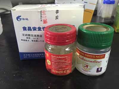 北京的苑女士認(rèn)為自己家的燕窩有點(diǎn)問題,因此將兩種燕窩樣品送到消費(fèi)者體驗(yàn)中心,請(qǐng)我們幫忙檢測(cè)亞硝酸鹽含量。將紅蓋、綠蓋分別標(biāo)號(hào)1、2。分別取樣品1mL至離心管中。加入2滴試劑1,搖勻后靜置5分鐘。加入2滴試劑2搖勻靜置10分鐘后與標(biāo)準(zhǔn)比色卡對(duì)比,該比色卡上的數(shù)值即為樣品中亞硝酸鹽的含量mg/kg(以NaNO2計(jì))。結(jié)果顯示,兩種燕窩亞硝酸鹽含量均為0.5 mg...[詳情]